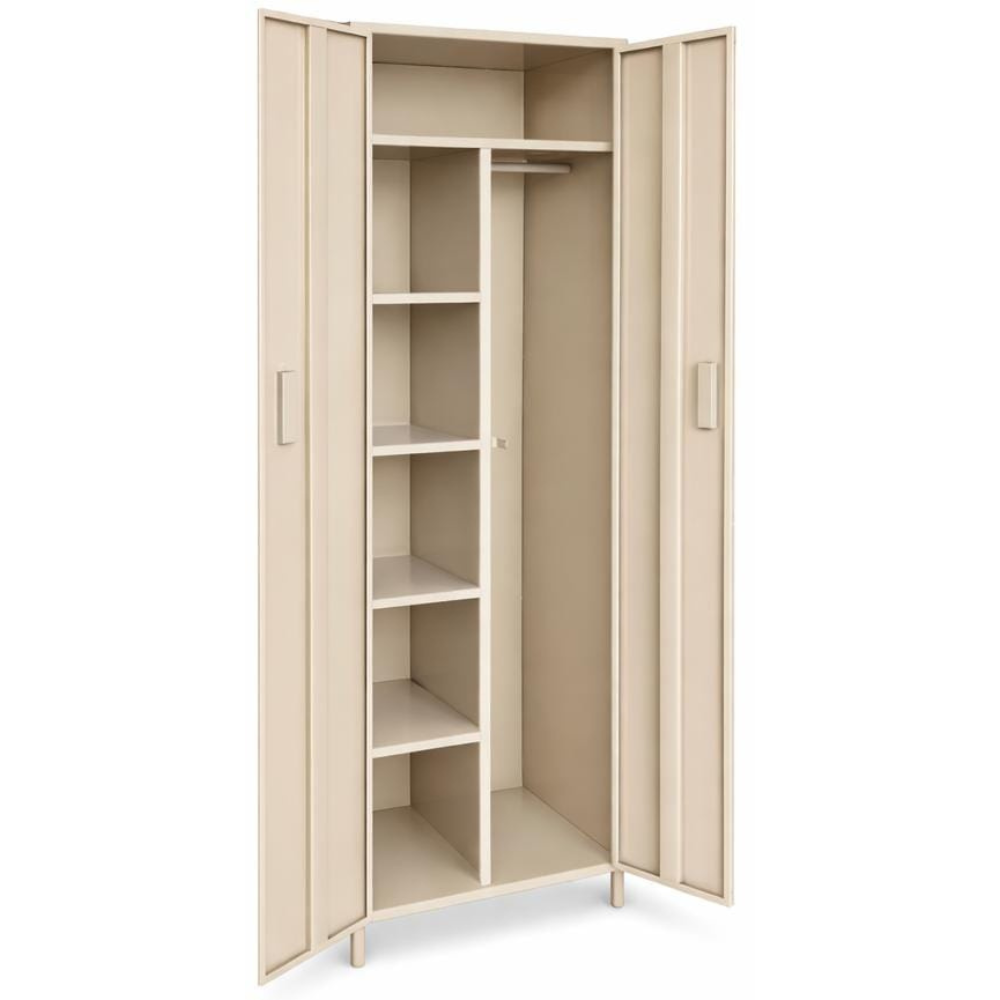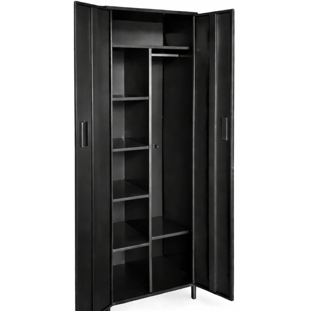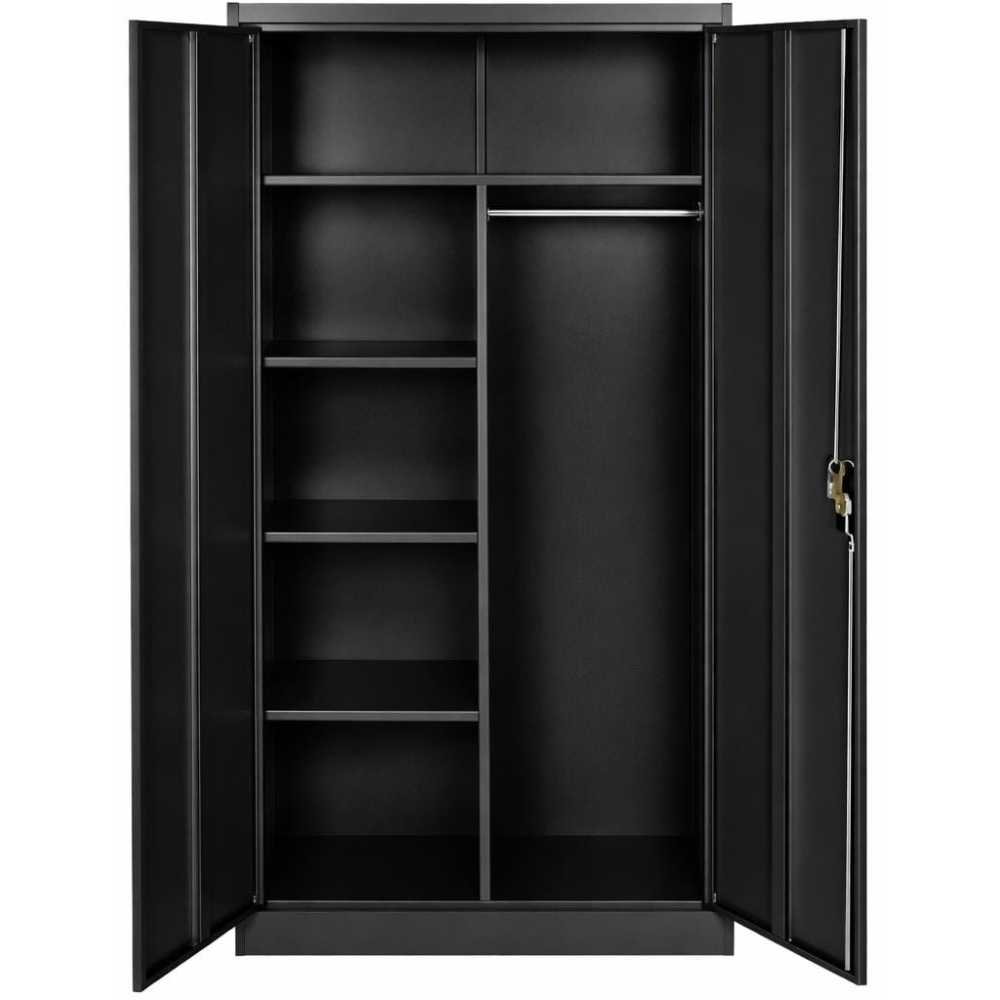 Armario multiusos ideal para organización en oficina, hogar o bodega. Fabricado en metal resistente, cuenta con barra para colgar, repisas internas y amplio espacio de almacenamiento. Incluye cerradura para mayor seguridad y diseño moderno en color negro.